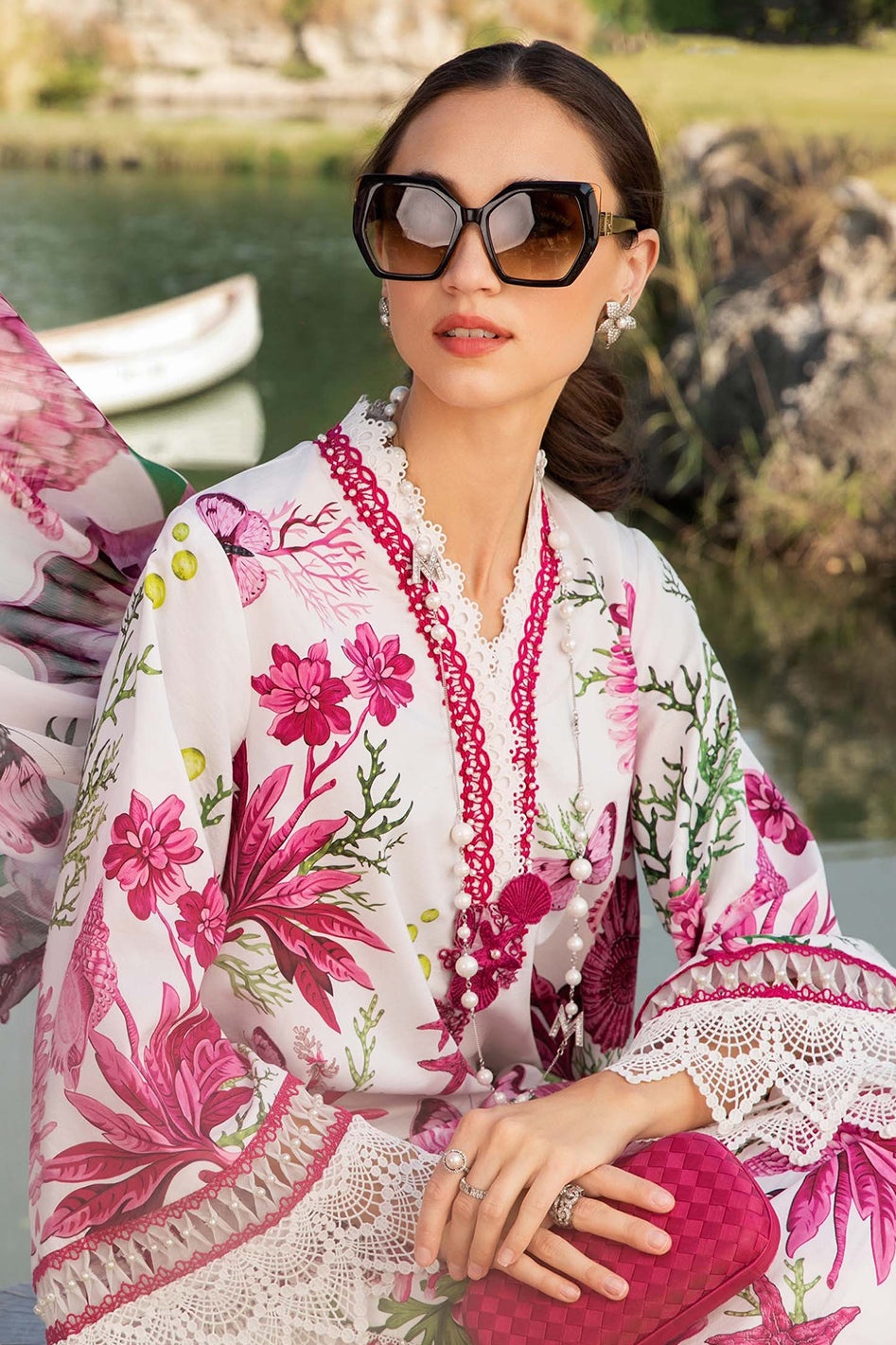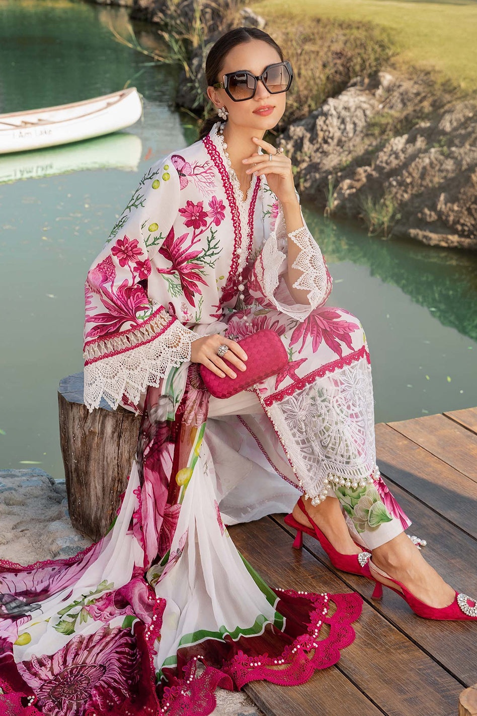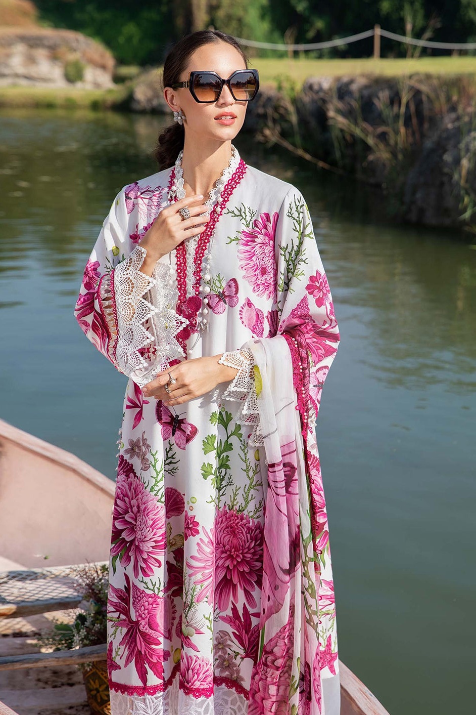 Shamoz silk shirt with embroidery patches shamoz silk trouser shamoz silk duppata ready to wear